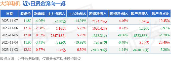 证券之星音讯,到2025年11月7日收盘,大洋电机(002249)报收于11.82元,跌落4.06%,换手率7.33%,成交量134.15万手,成交额15.96亿元。
