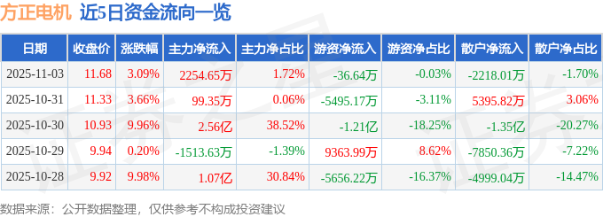 证券之星音讯,到2025年11月3日收盘,方正电机(002196)报收于11.64元,上涨2.74%,换手率26.27%,成交量128.25万手,成交额14.68亿元。