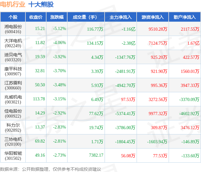 个股体现方面,电机职业当日领跌股为湘电股份(600416),该股当日报收15.21,跌落5.12%,成交量116.77万,主力资金净流出1.16亿元。大洋电机(002249)以跌落4.06%紧随其后,该股当日成交量134.15万,主力资金净流出2.38亿元。除此之外,迪贝电气(603320)、康平科技(300907)、江苏雷利(300660)均进入当日熊股之列。具体个股列表见下表:
